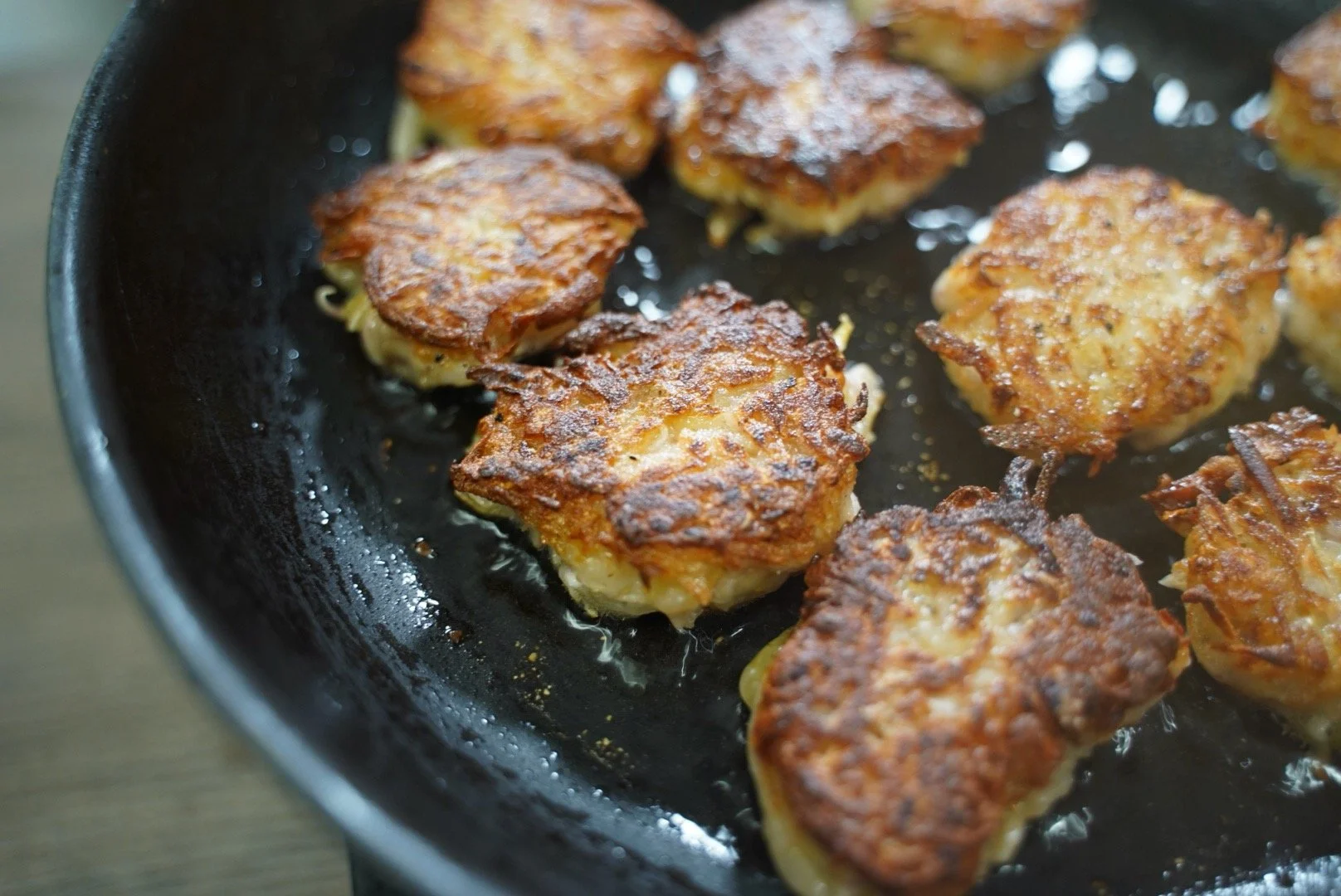 Now the fun part! Heat up some oil ( I like olive, but canola, coconut, or avocado are fine as well) on medium heat until the pan is nice and hot. Add your fritters and cook until browned, about 3-5 minutes. Flip and repeat on the other side. When the fritters are fully cooked, remove from the pan and place on a paper towel-lined plate and season with salt while they are still hot. This helps the salt adhere to the food.