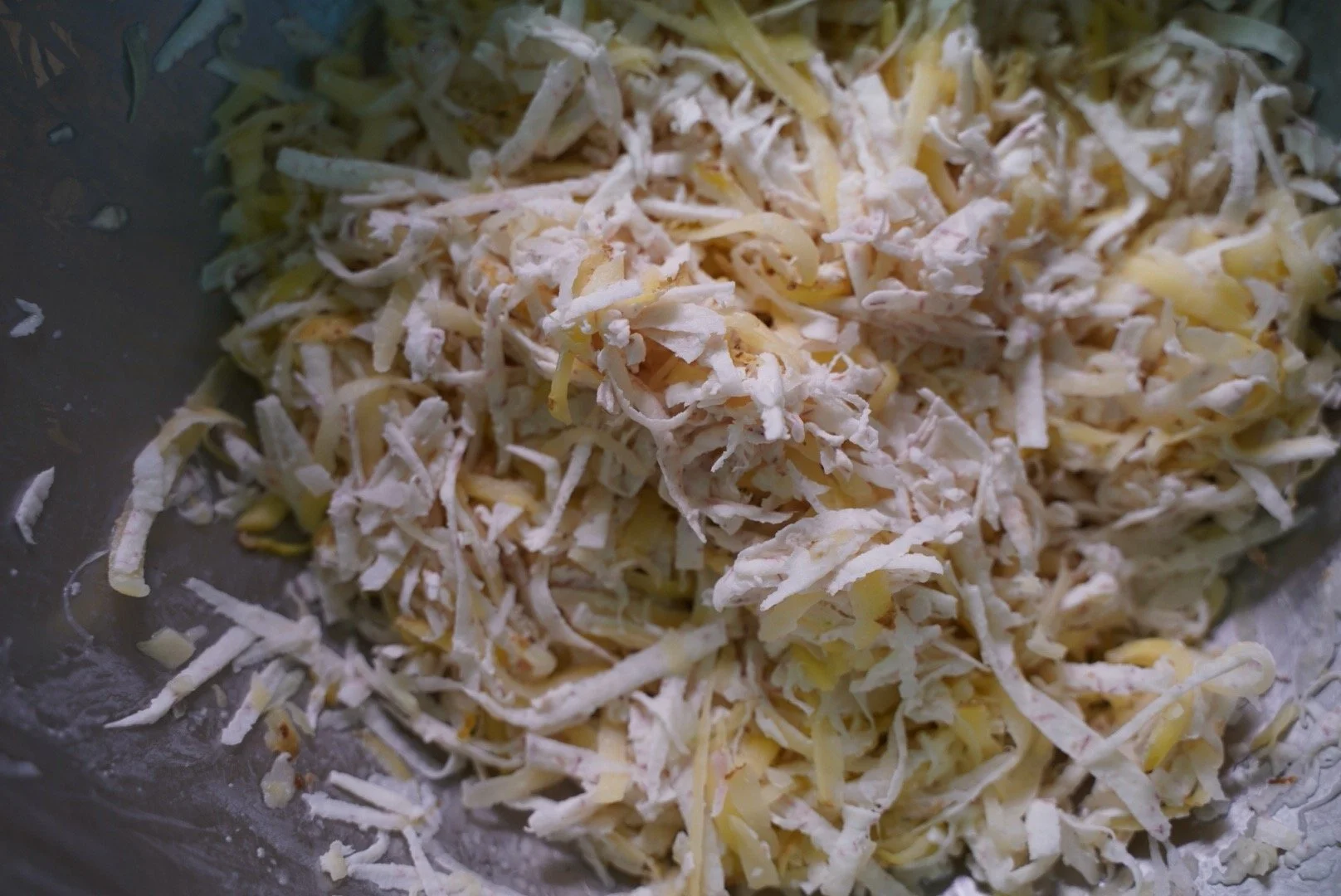 First, we will shred the taro along with some Yukon potatoes and onion. Squeeze the shredded mixture together tightly to release any excess moisture. Add to a bowl with the seasonings and flour. Stir thoroughly until the mixture holds together. You may need to adjust the flour to get the right consistency. Add additional flour, a tablespoon at a time, until it’s just right.