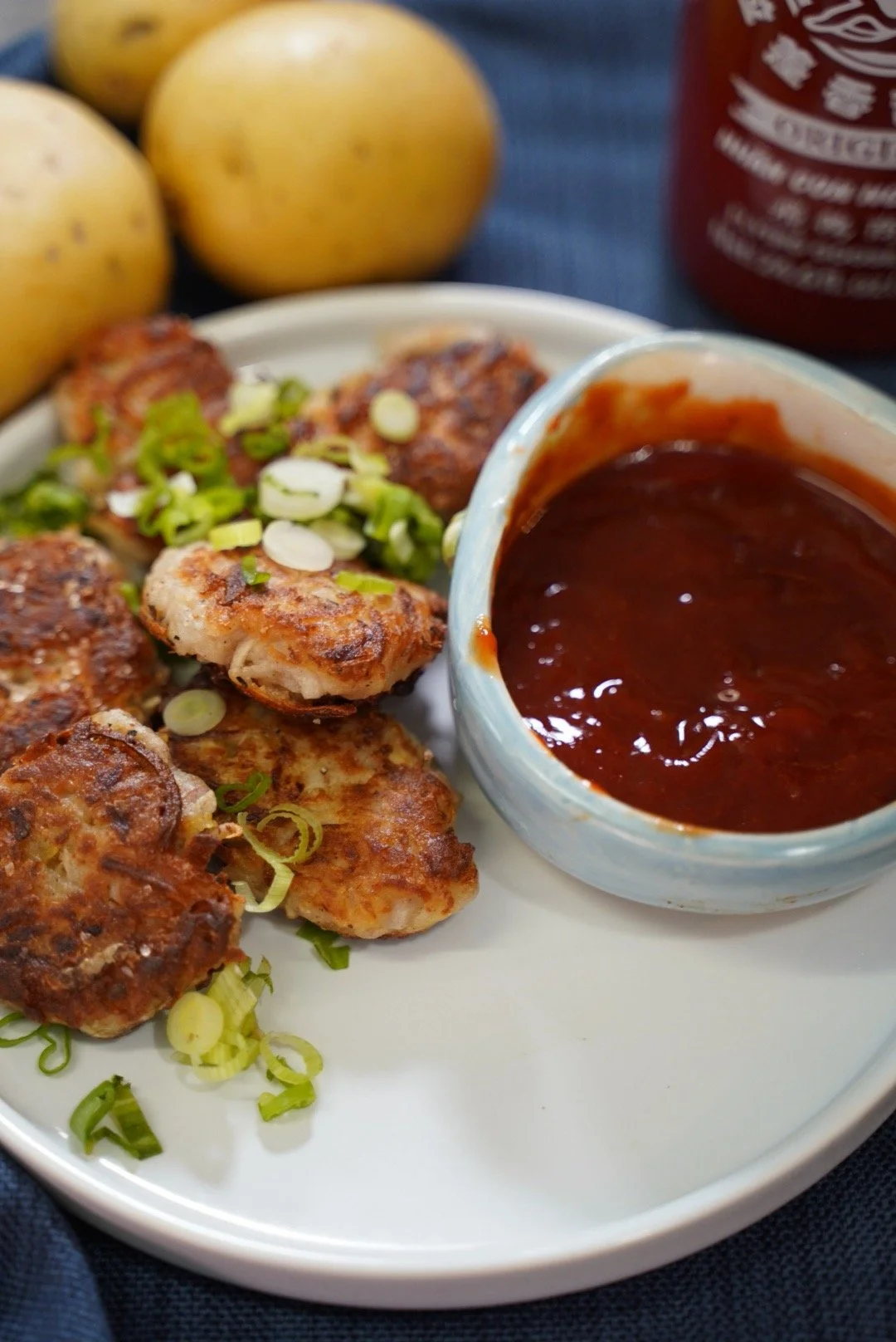 For the dipping sauce, we are keeping it simple with this one! Soy sauce and ketchup bring umami, salt, and sweetness, with the sriracha adding a note of spiciness. Add all the ingredients to a bowl and mix until combined. Also, HEB has the best ketchup.